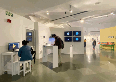 The installation, Seasons of Persuasion, presents a different visualisation of the political data campaign, where a circle of innumerable bubbles in varying colours on four different screens is displayed to represent each second of political advertising for each day on social media.